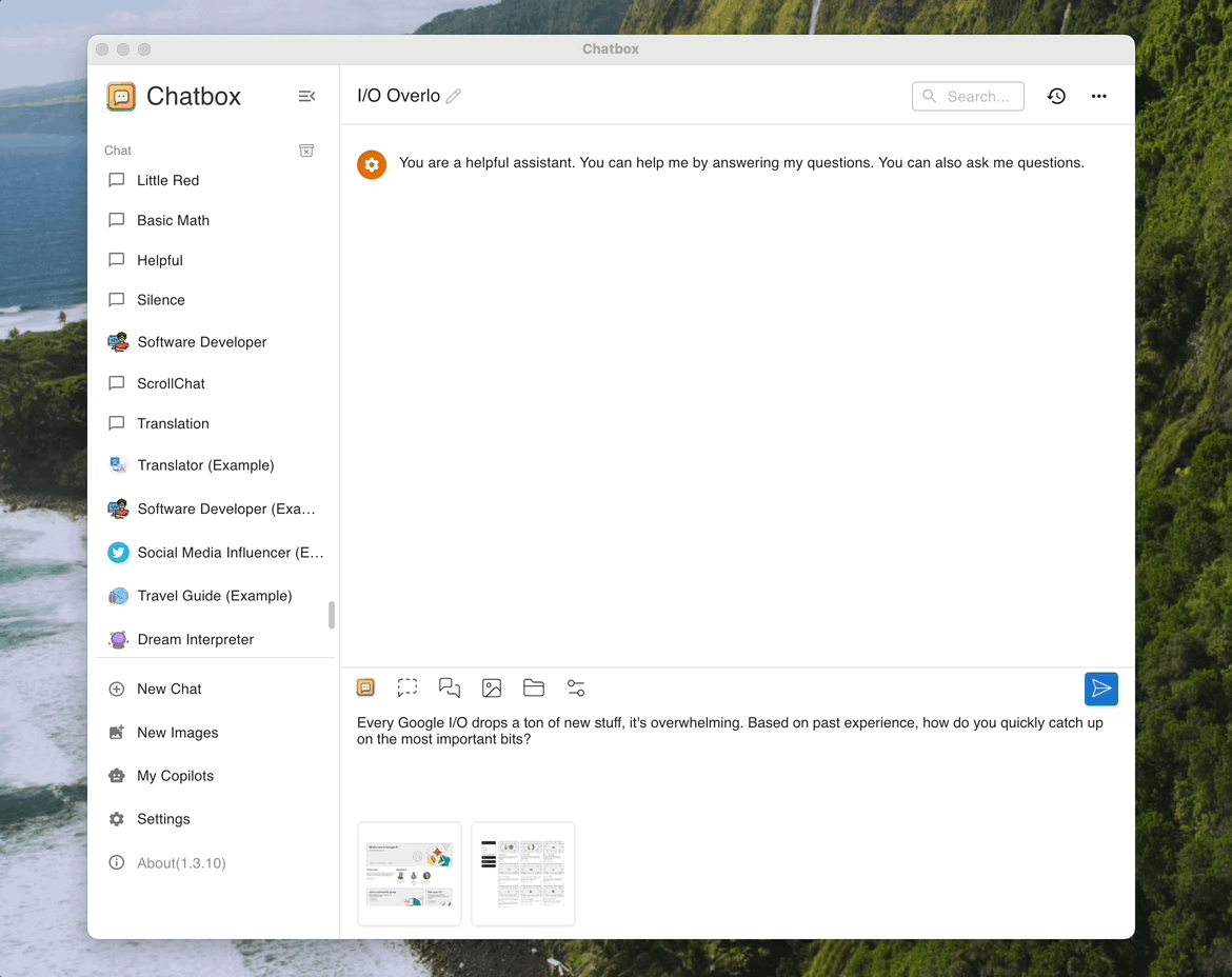 - Added an image generation feature (Image Creator); you can now generate images within Chatbox, powered by the Dall-E-3 model.